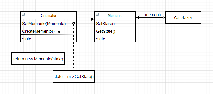 - 语言支持:为了实现宽接口和窄接口,理想的语言应该可以支持两级的静态保护。在C++中,把Originator作为Memento的一个友元,然后使宽接口是私有的,窄接口是公有的