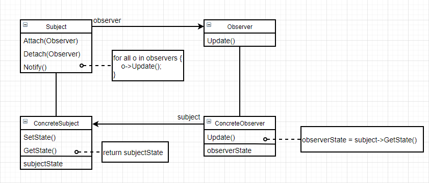 - ConcreteObserver收到通知后,向ConcreteSubject查询消息,以使自身和目标的状态保持一致